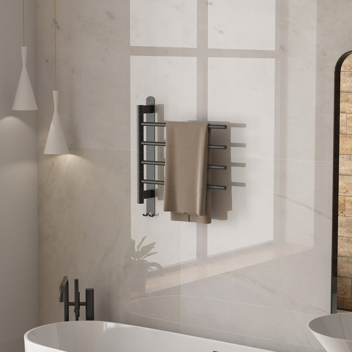 4桿電熱毛巾架 4 bar heated towel rail 材質(zhì)Material:SS201/SS304 功率Power:220V/60W 表面Surface:Black Painted 黑色噴塑 尺寸Size:500*95*573mm 包裝Ctn size:520*60*580mm